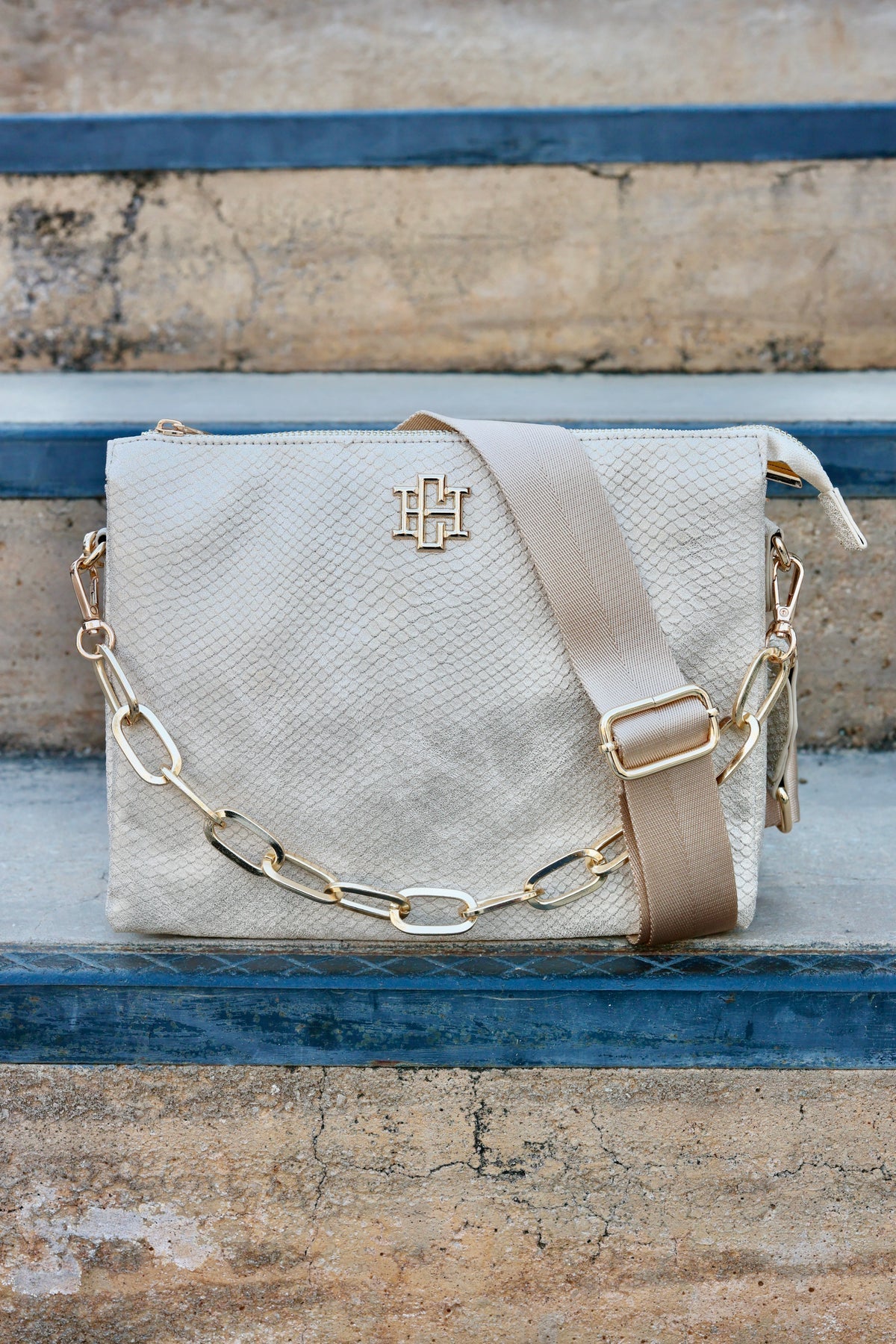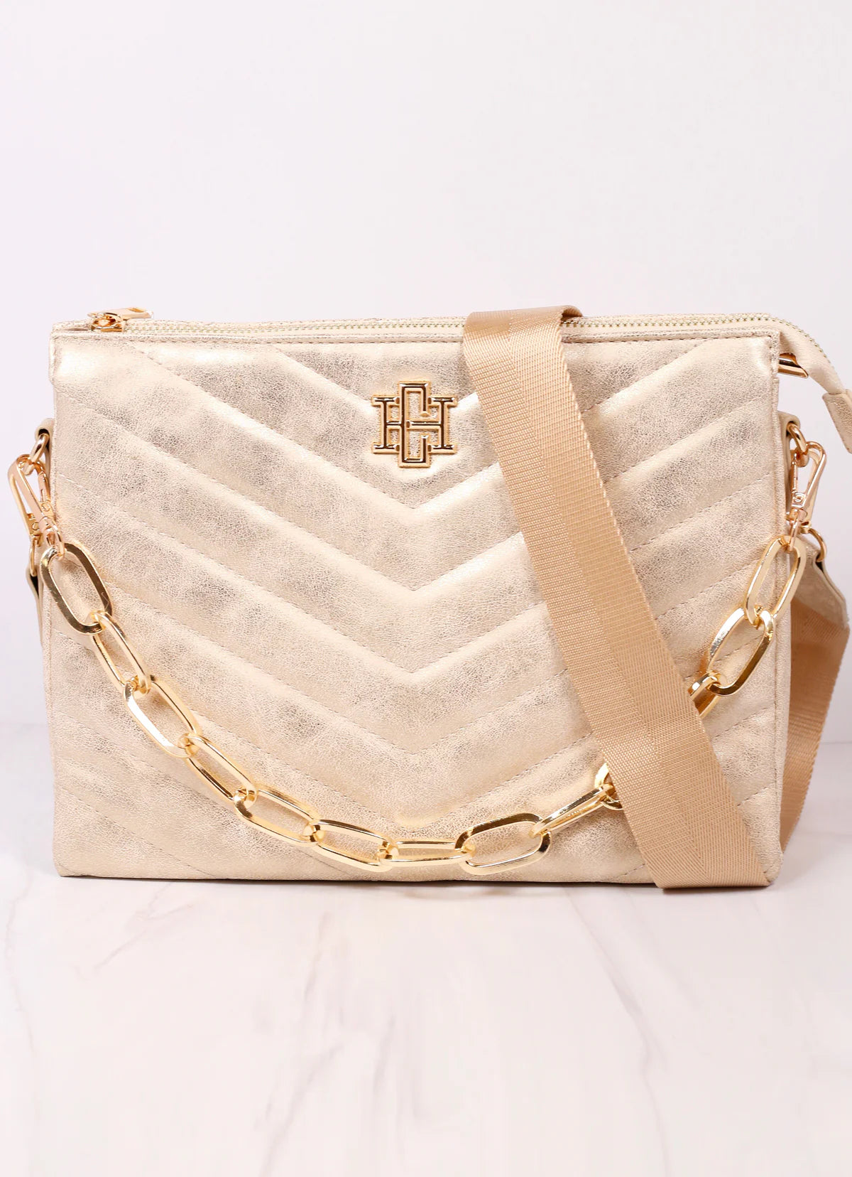 This crossbody is so fashion forward! It has a chunky gold chain accent that is removable, and it can be used as a carrying strap as well. The crossbody strap is made of nylon and is also adjustable and removable. The top zipper closure leads to two open compartments as well as a third middle zippered section. It also has two smaller internal open pockets and one zippered pocket.