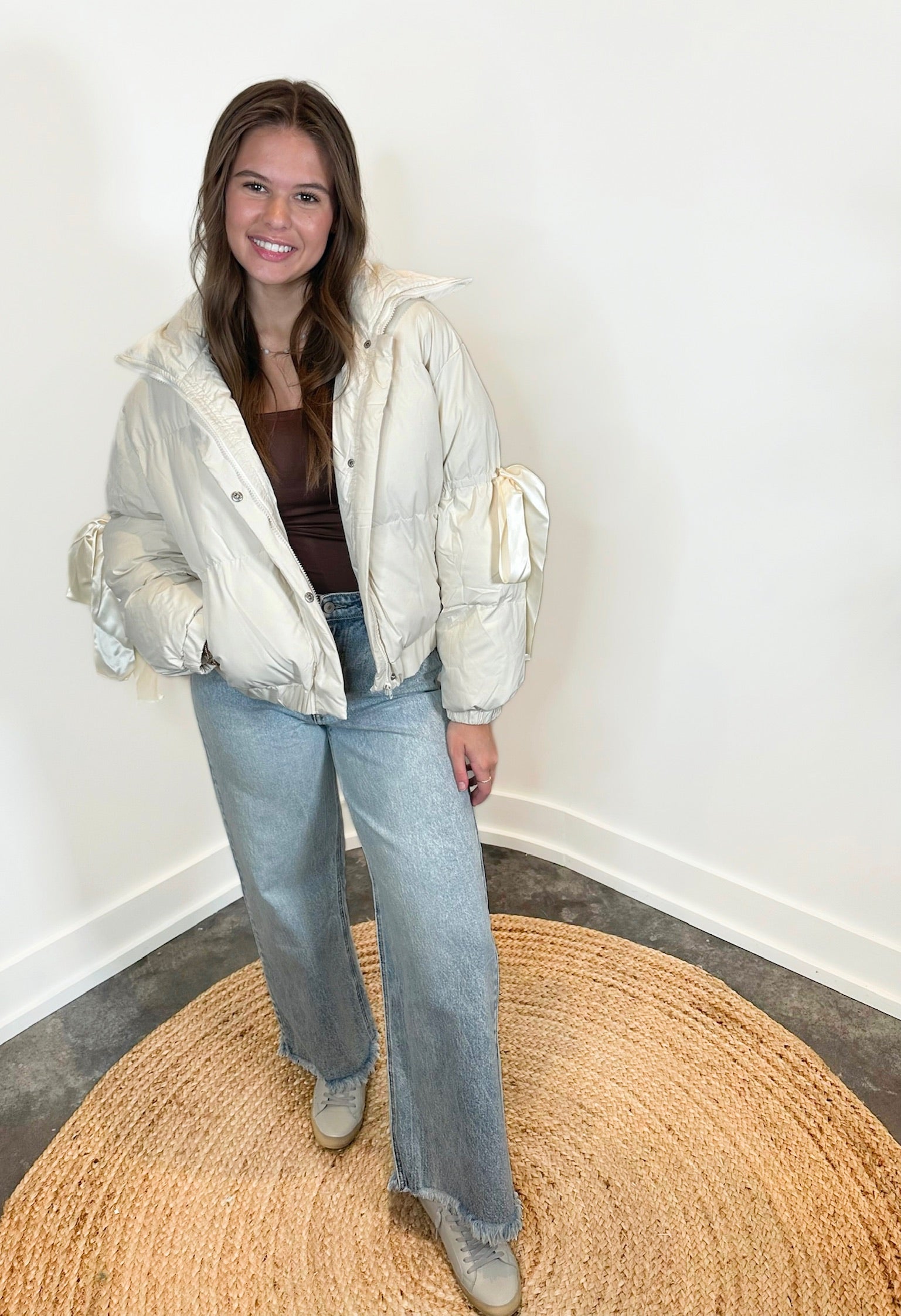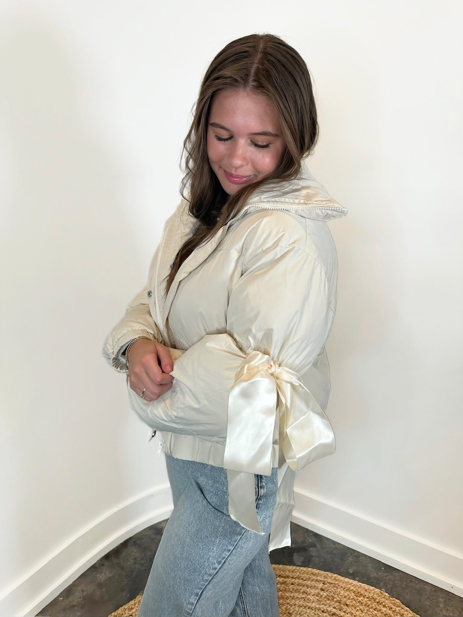 Stay stylish and warm with the Aylani Puffer Jacket. This collared jacket features a unique bow knot elbow string and a zipper and button closure for a secure fit. Plus, keep your hands cozy with the side pockets. Perfect for a quirky and playful fashion statement.