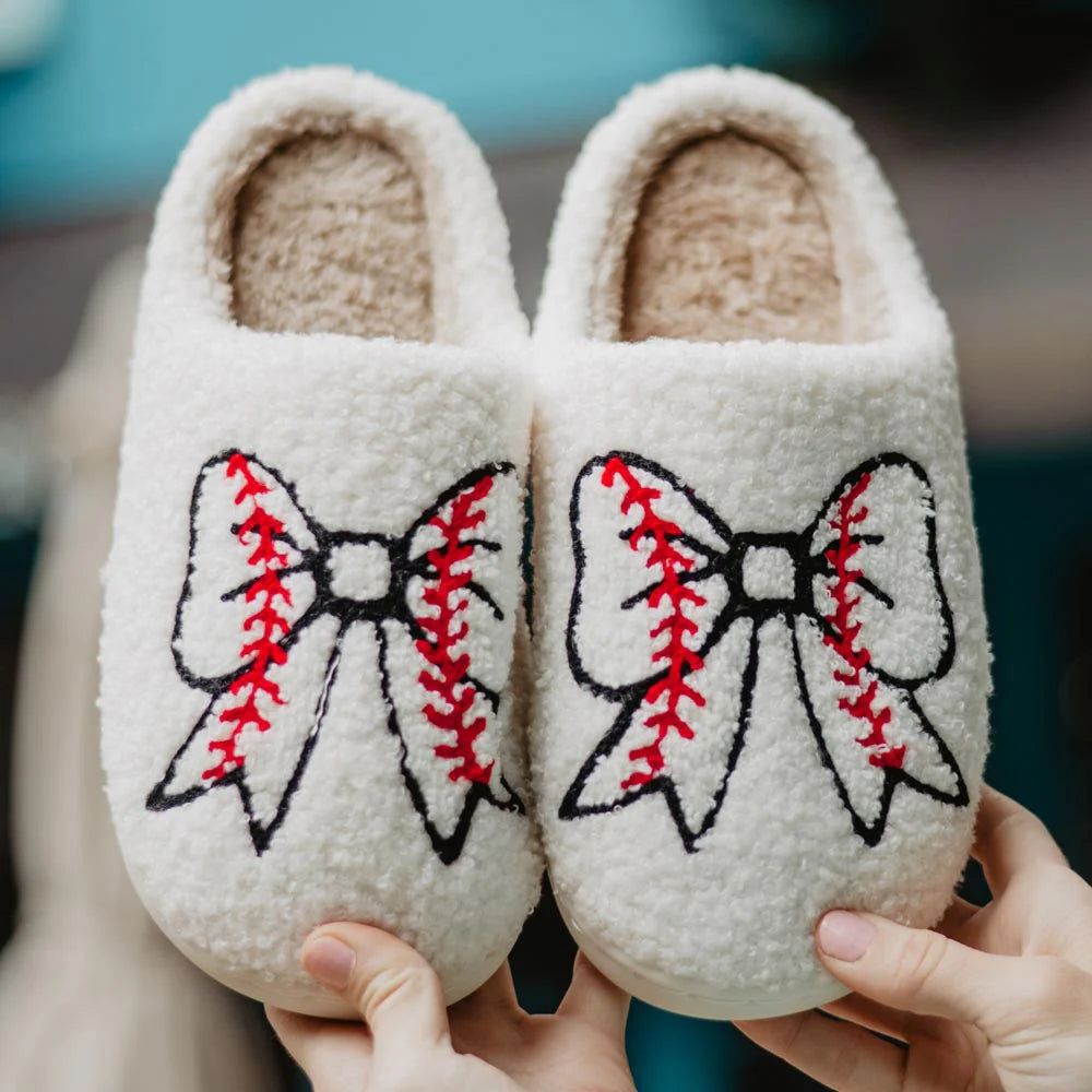 Step up your loungewear game with our Baseball Bow Slippers! Perfect for baseball fans and moms, these cozy slippers feature a playful bow with a baseball print. Stay comfy and stylish whether you're at home or running errands. Want more fun? Check out our Baseball Happy Face Slippers.