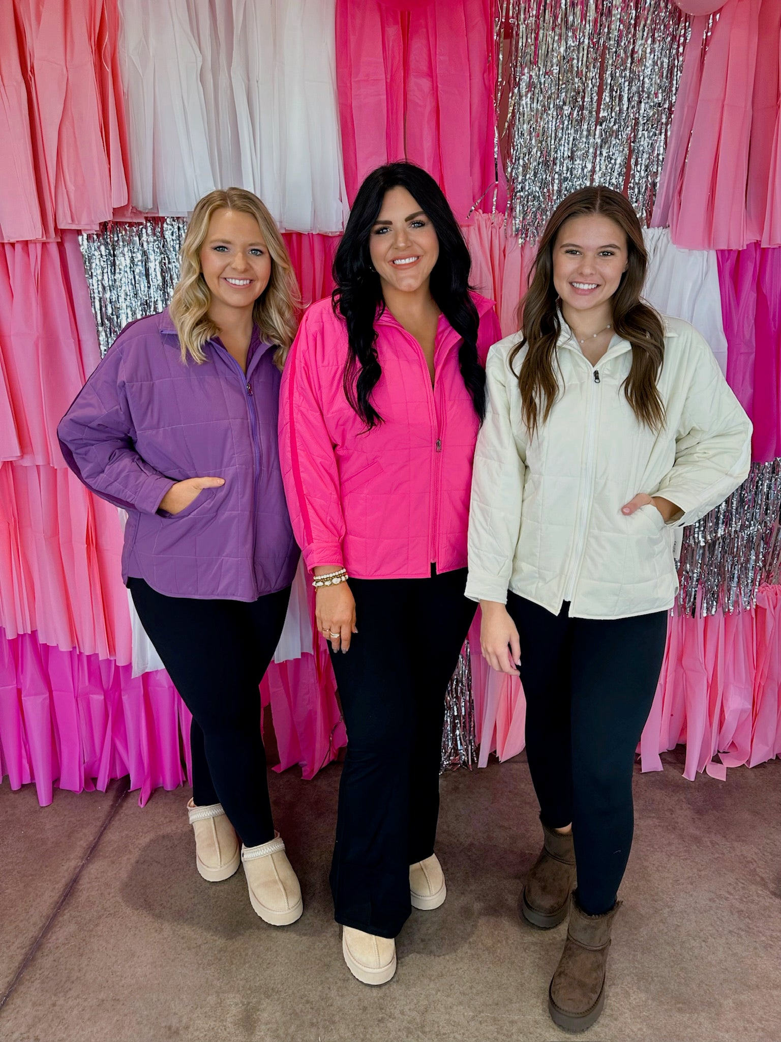 This stylish piece features a rich purple hue that adds a pop of color to any ensemble. The quilted squares design adds texture and visual interest, while the zipper closure ensures easy wearability. Perfect for transitioning between seasons, this jacket offers both style and functionality. Whether pairec with jeans for a casual look or layered over a dress for a night out, this versatile jacket is sure to become a wardrobe staple. Stock up now and give your customers the opportunity to make a bold fashion statement with this chic and trendy piece!