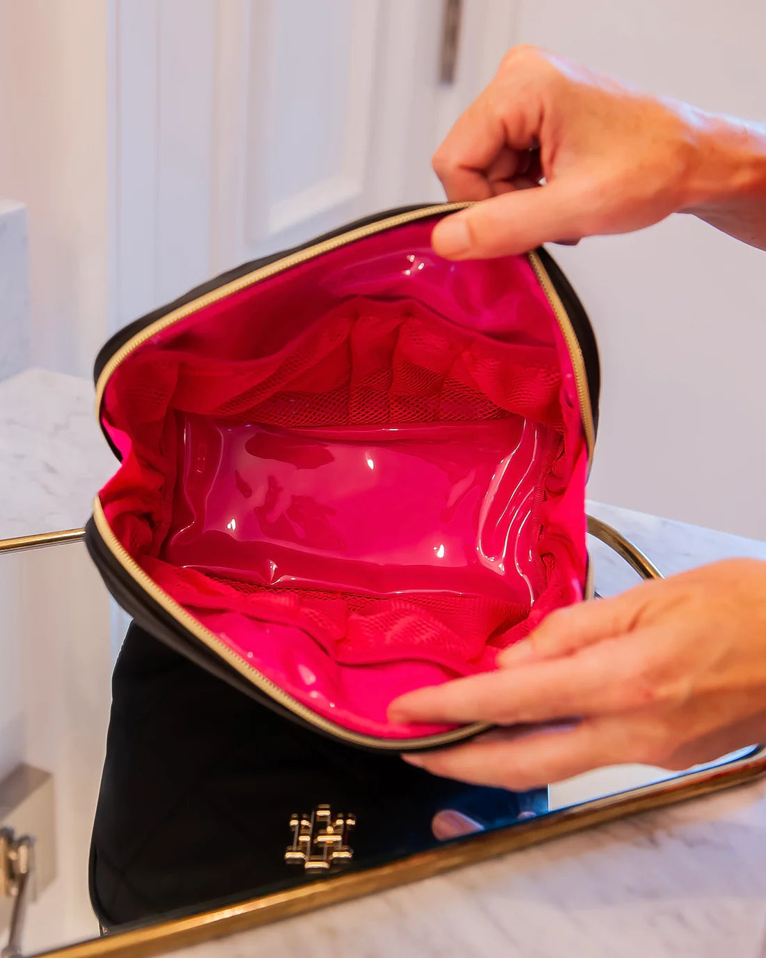 The Capri Large Pouch is your new travel buddy with a playful twist! Crafted from vegan embossed croc leather and featuring a stylish quilted fabric design, it opens wide with an elongated zipper for easy access to your makeup, toiletries, or hair accessories. Inside, a hot pink wipeable lining and handy mesh pockets keep your essentials organized and ready to go. Chic, spacious, and fun—this pouch is perfect for staying fabulous on the move!