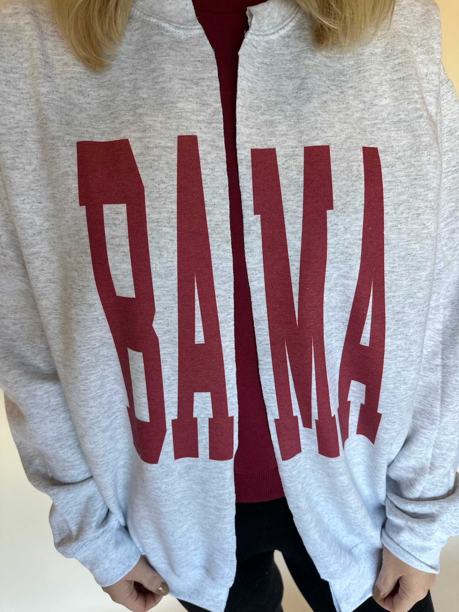 Show your Crimson Tide pride in style with our Bama oversized sweatshirt — the perfect cozy layer for game days and beyond. Designed with a relaxed fit and crafted from soft fleece, this sweatshirt delivers both comfort and team spirit. The bold crimson “BAMA” block lettering pops against the classic heather gray, creating a timeless collegiate look. Pair it with leggings, jeans, or joggers for an effortless outfit you’ll love cheering in all season long.