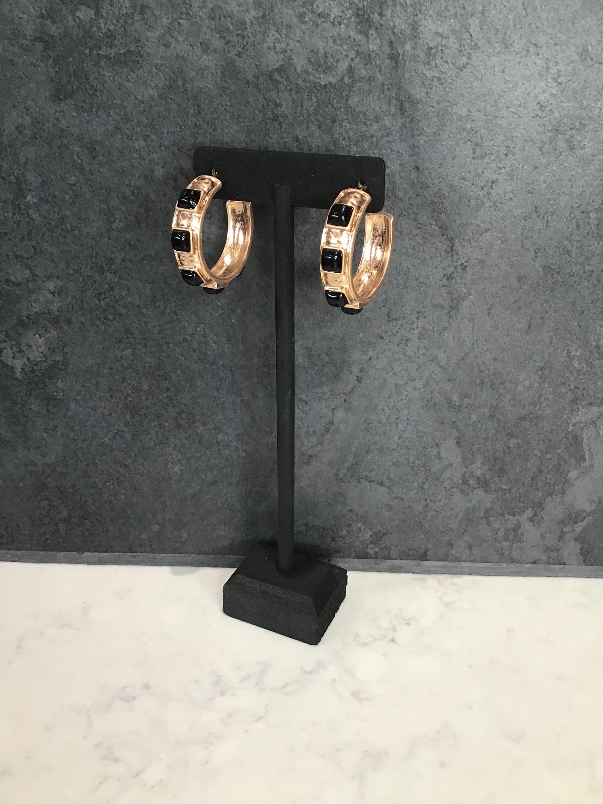 Add some sparkle to your look with the Elani Hoop Earring in Black. Featuring gold hammered hoops and a charming square stone detail, these earrings add a playful twist to a timeless style. Perfect for brightening up any outfit with effortless flair and a dash of fun.