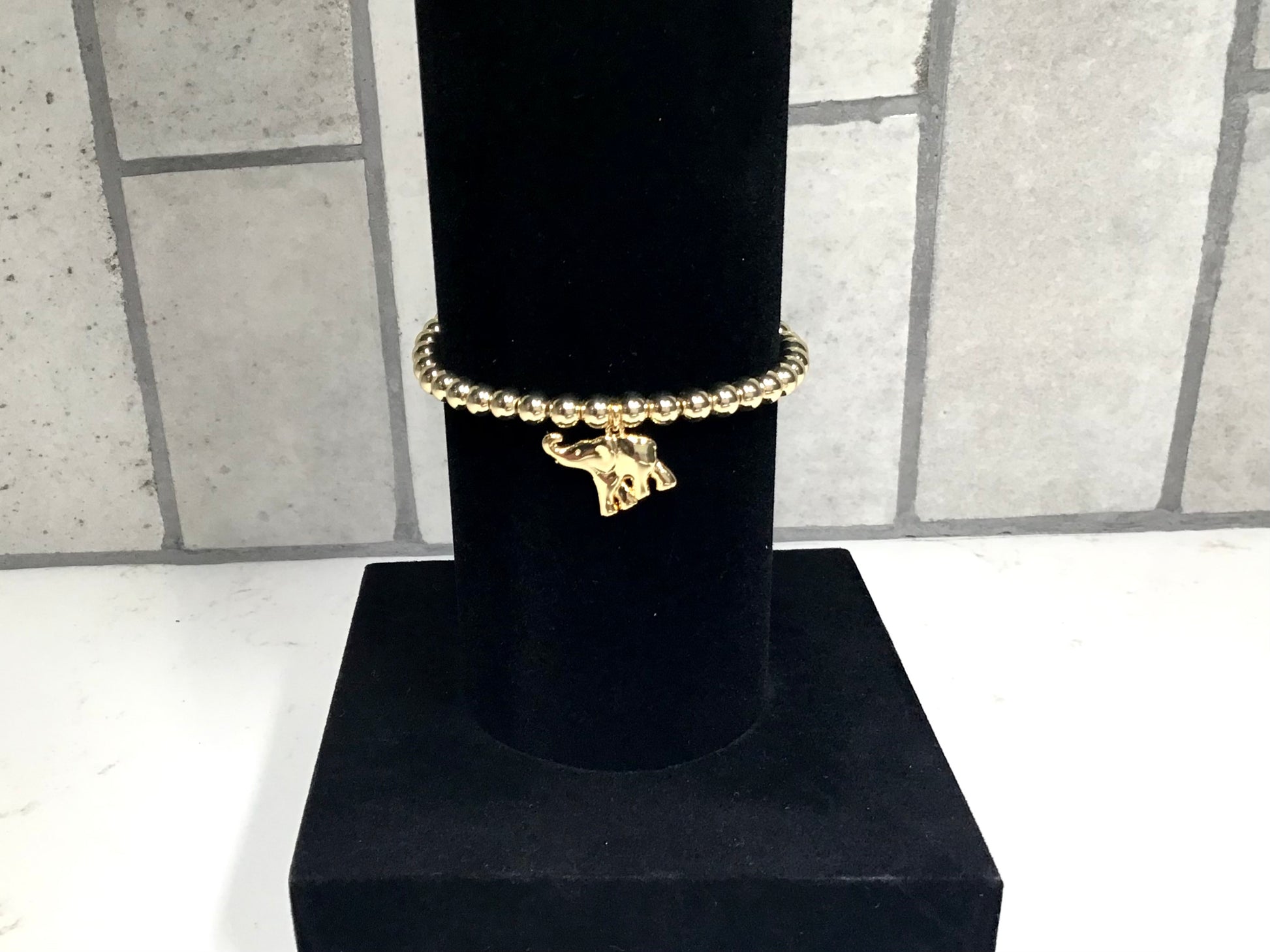 This bracelet is a chic and timeless piece featuring small round gold beads strung together on an elastic band, creating a classic stretch-fit design that’s easy to slip on and comfortable to wear. Dangling from the center is a charming gold elephant charm, adding a playful yet elegant touch.