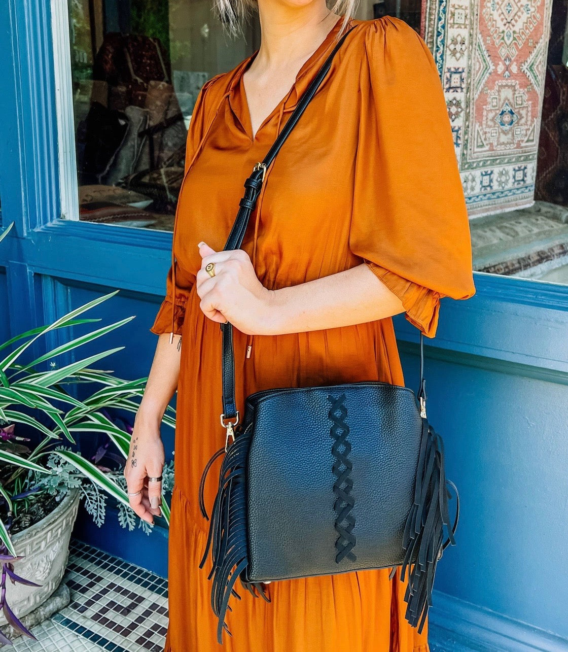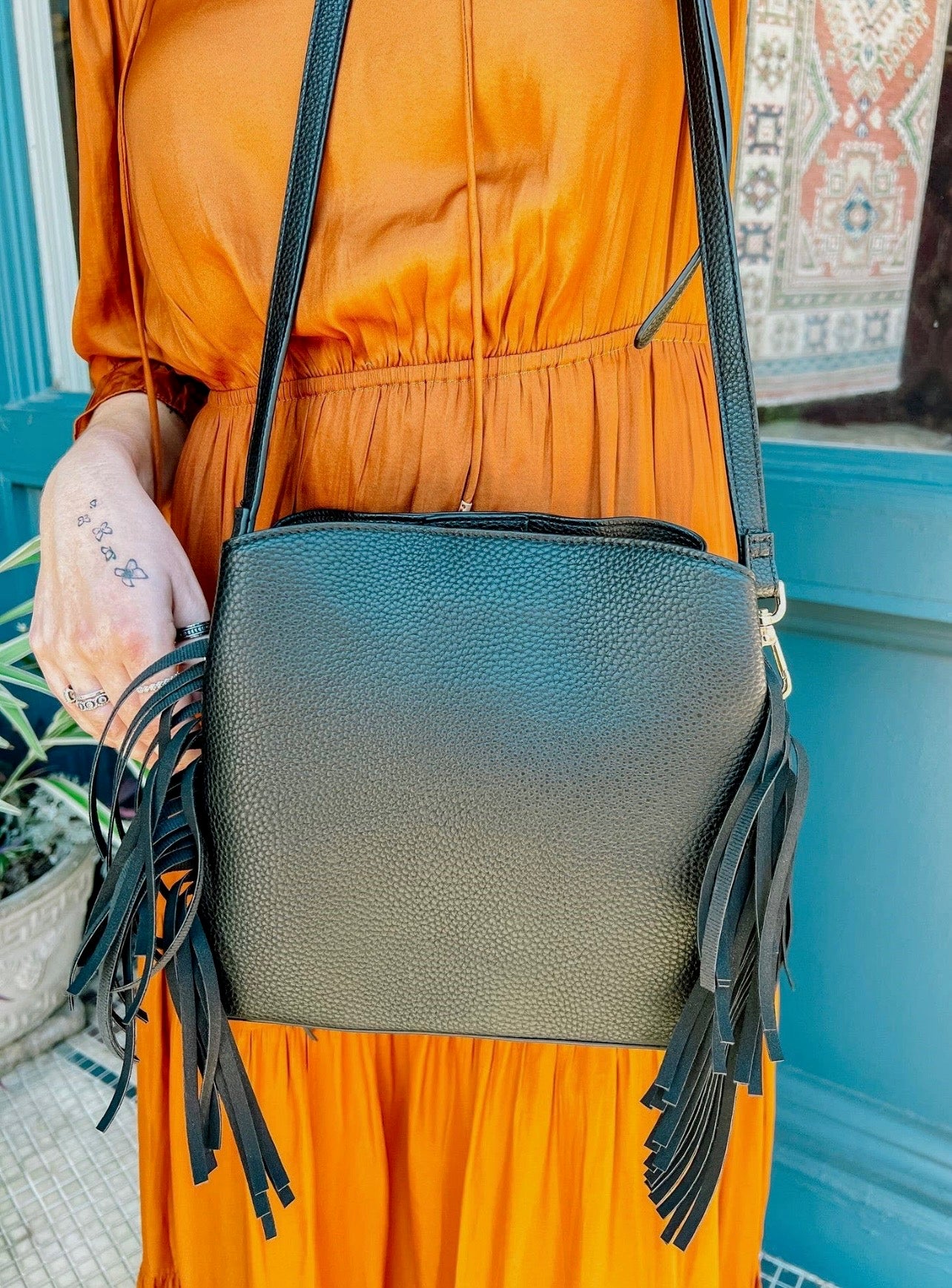 Vegan Leather Crossbody with fringe on the side and X detailing sewn on front. Magnetic closure on the top, and center zippered section. Very roomy sections on either side on Large Center Compartment. The Strap is removable and also adjustable. To top it all off this bag has feet on the bottom of crossbody to serve as extra protection.