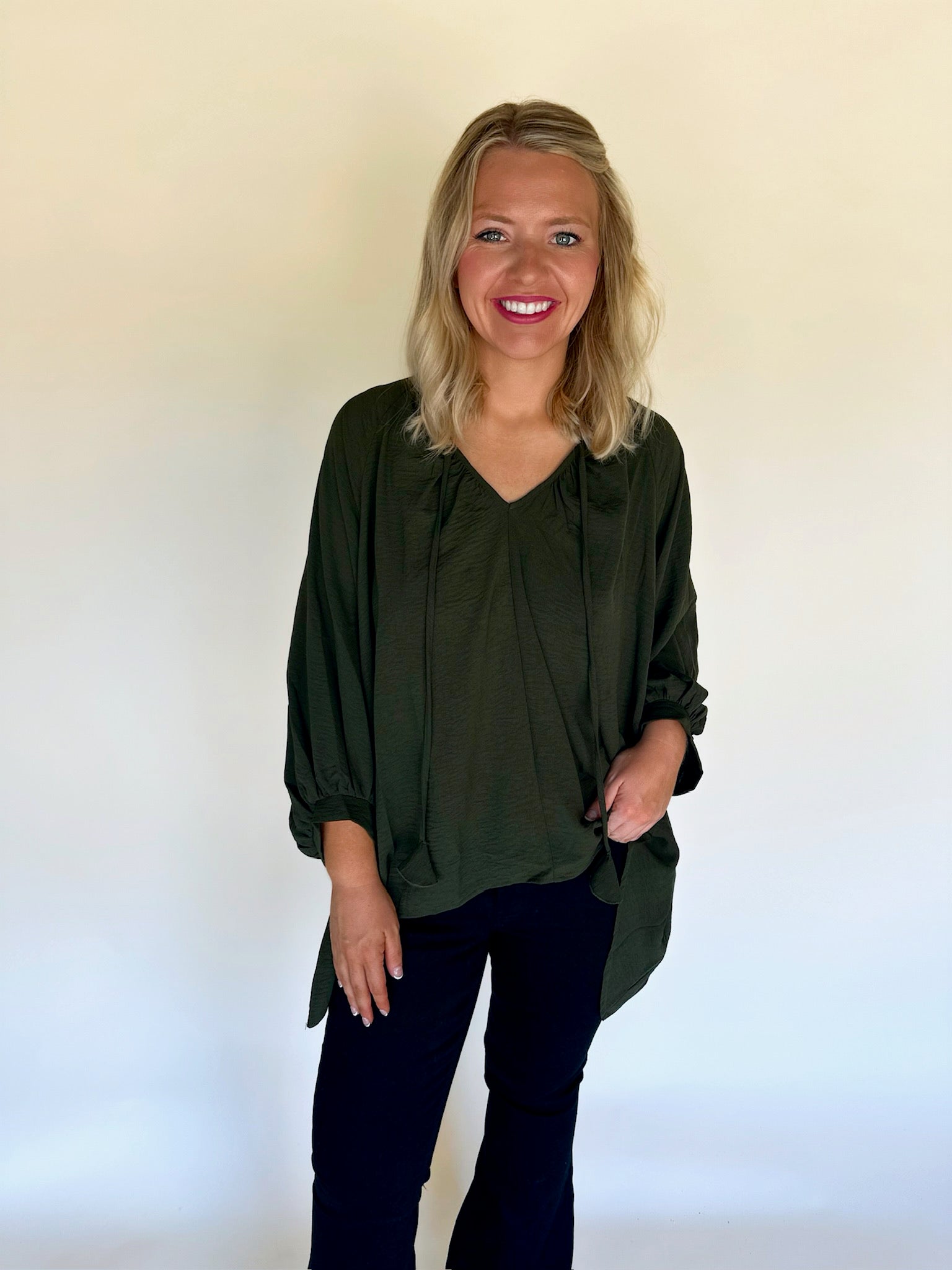Embrace effortless charm with the Galyn Handkerchief Hem Blouse. Featuring a playful handkerchief hem and breezy 3/4" lantern sleeves, this poncho-style top adds whimsical movement to your look. Perfect for layering or wearing solo, it’s a fun way to brighten your everyday wardrobe.