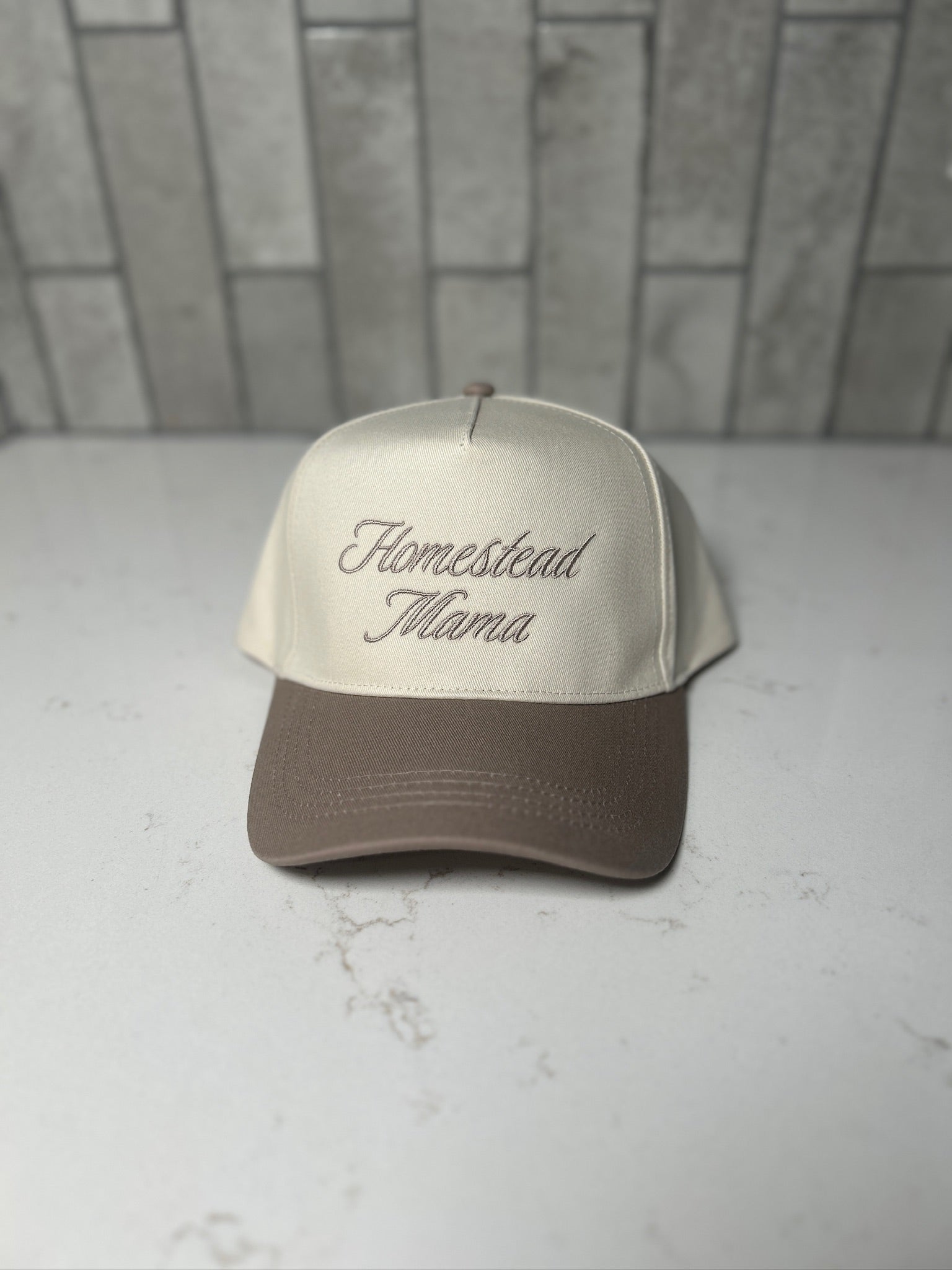 Embrace your homestead vibes with the Homestead Mama Embroidered Hat! This beige and natural 5-panel cap features a structured fit and adjustable snaps for comfort all day long. Perfect for mamas who love a touch of rustic charm with a playful twist.