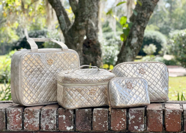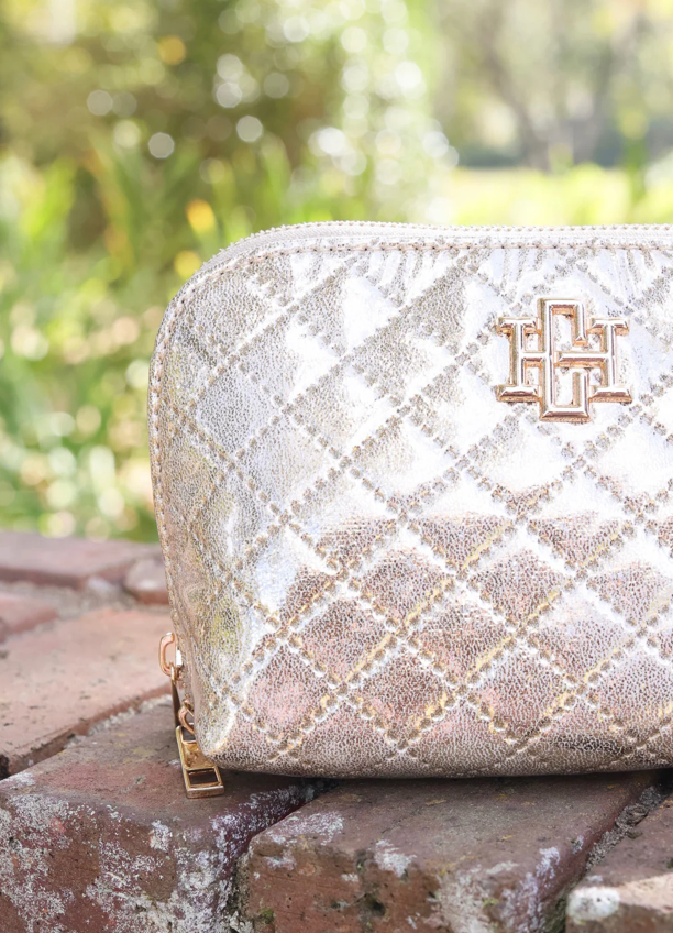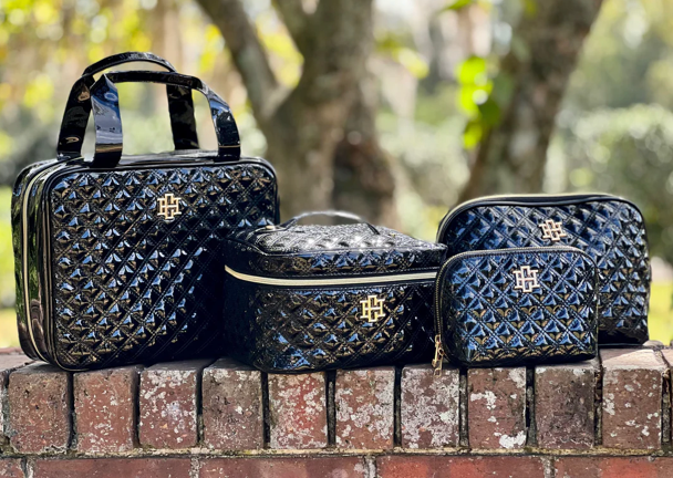 This gorgeous vegan patent leather pouch is part of our makeup and travel collection. It has a sleek and compact body style with a quilted fabric design. The elongated zipper provides easy access, making it perfect for organizing makeup, toiletries, and hair accessories. The spacious interior is lined with vibrant hot pink, wipeable nylon. It's the perfect size pouch to keep in your everyday tote for chargers, cosmetics, and so much more.