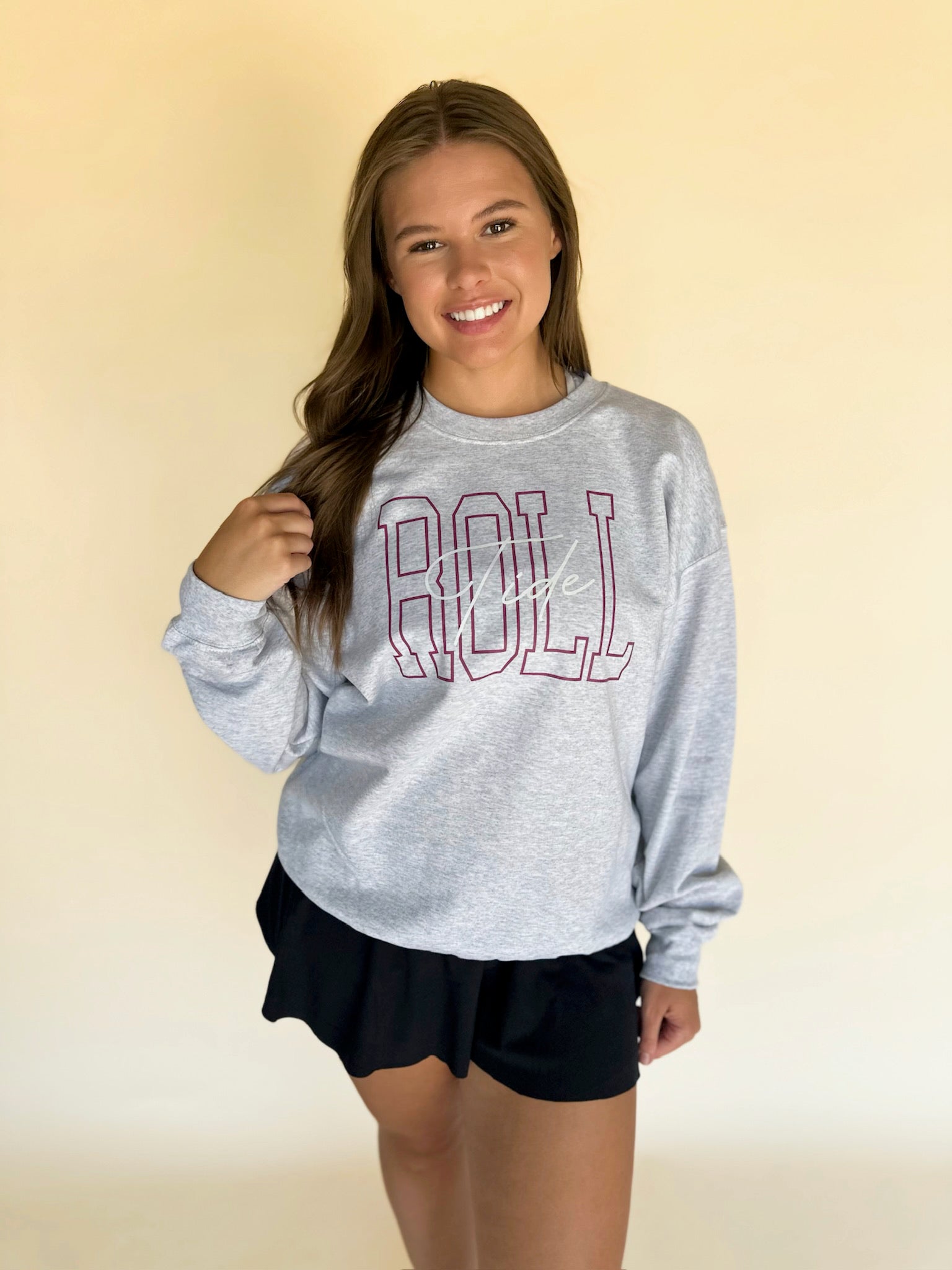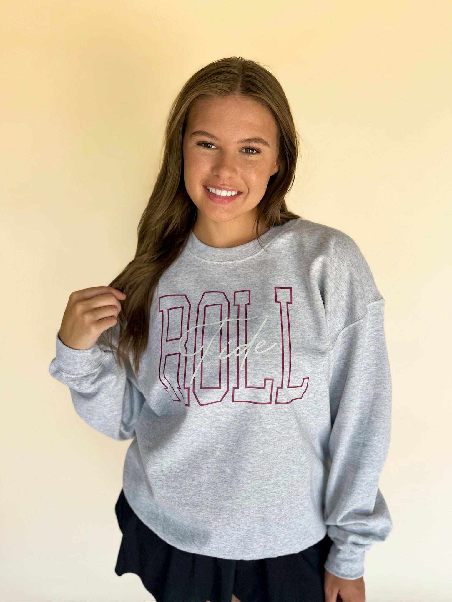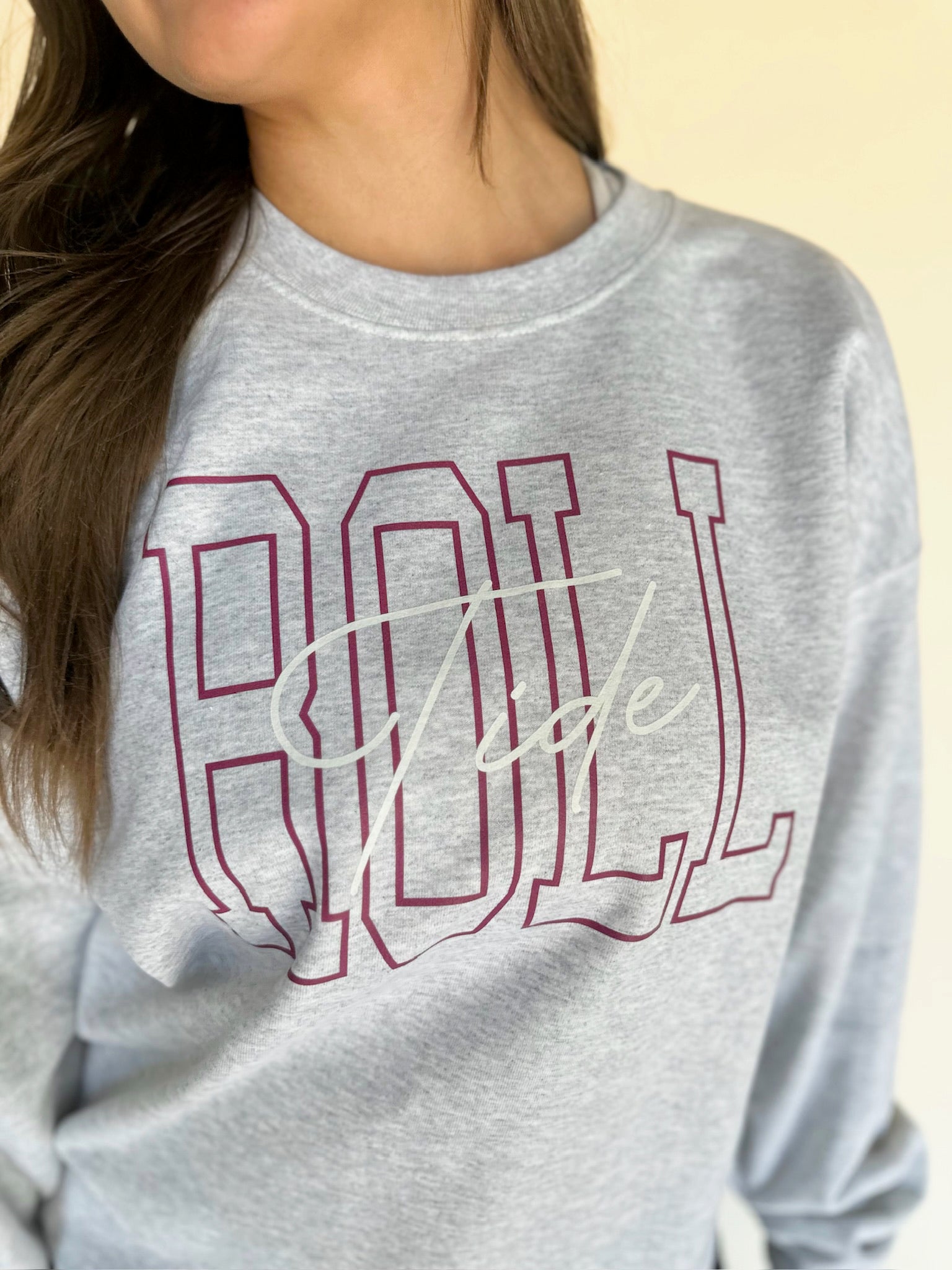 Show off your team spirit in cozy style! This heather gray crewneck features bold crimson block lettering spelling ROLL, layered with an elegant script Tide across the front. The oversized collegiate-inspired design makes it a game day favorite while still being cute enough for everyday wear.