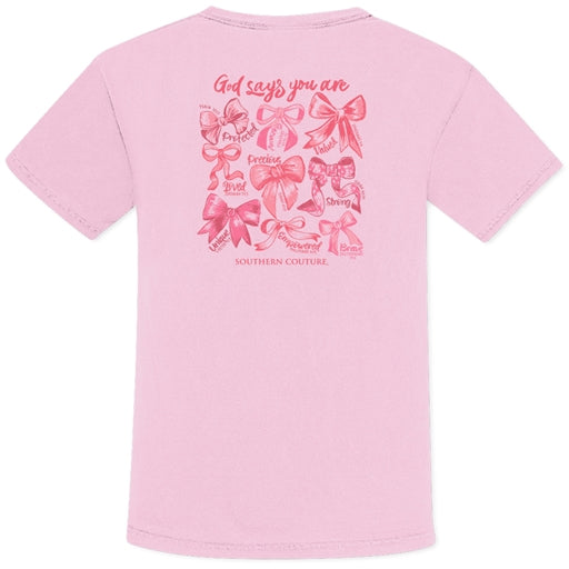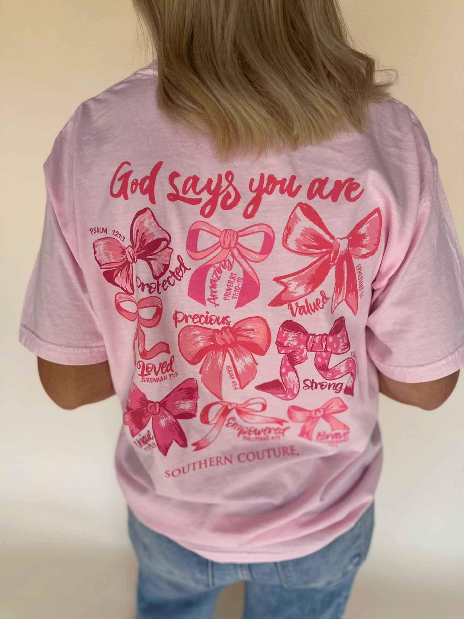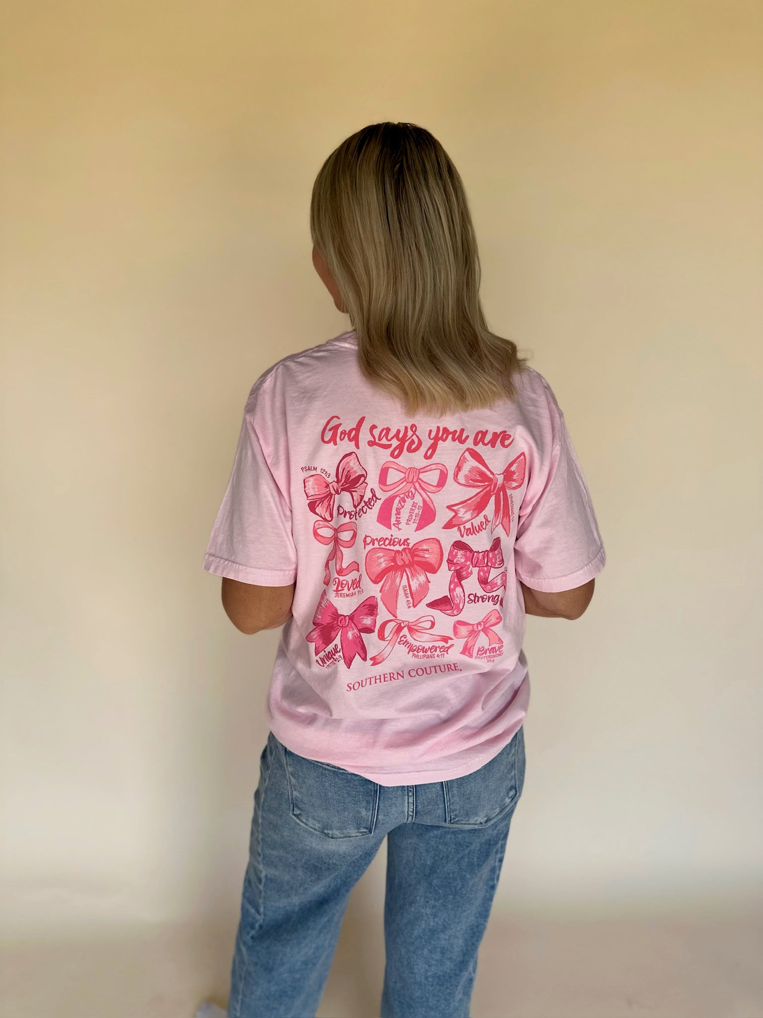 Bring smiles and faith together with the SC Comfort God Says You Are Bows T-shirt! This playful tee combines cozy comfort with a cheerful message, featuring cute bow accents that add a fun, feminine touch. Perfect for brightening your day while sharing a positive vibe.