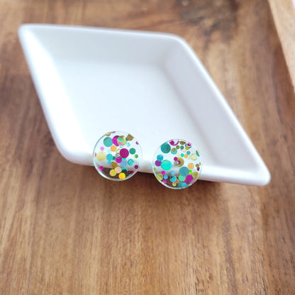 Add a pop of fun to your outfit with our Sophie Confetti Studs! These circle-shaped stud earrings feature a durable and lightweight acrylic design with glitter confetti, perfect for those with sensitive skin thanks to hypoallergenic stainless steel posts. With a 15mm size, they're just the right touch of whimsy for any occasion.