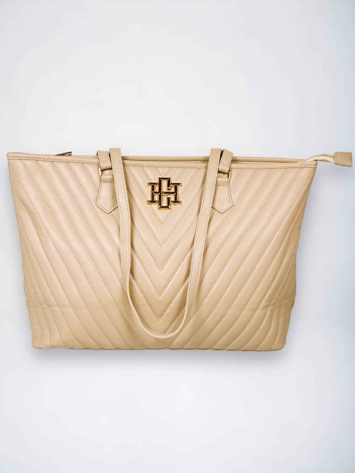 This fabulous tote has a V quilted pattern with a vegan leather material. It has two elongated handles and the Caroline Hill logo on one side. It also has a zippered top closure leading to the interior of the bag. There is one internal zippered pocket and two open pockets as well as feet on the bottom of the bag for added protection. Such a great style for work, travel, and everyday wear!